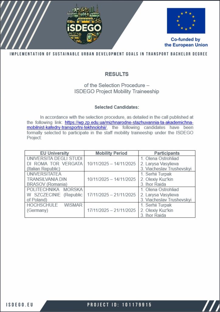 Витрати по мобільності покриваються за рахунок проєкту ISDEGO за програмою Erasmus+. На конкурс з відбору претендентів до академічної мобільності допускаються представники професорсько-викладацького складу, що беруть участь в розробці та оновлені освітніх компонентів запланованих до впровадження в рамках реалізації проєкту ISDEGO «Впровадження цілей сталого розвитку міст у транспортній галузі на бакалаврському рівні».