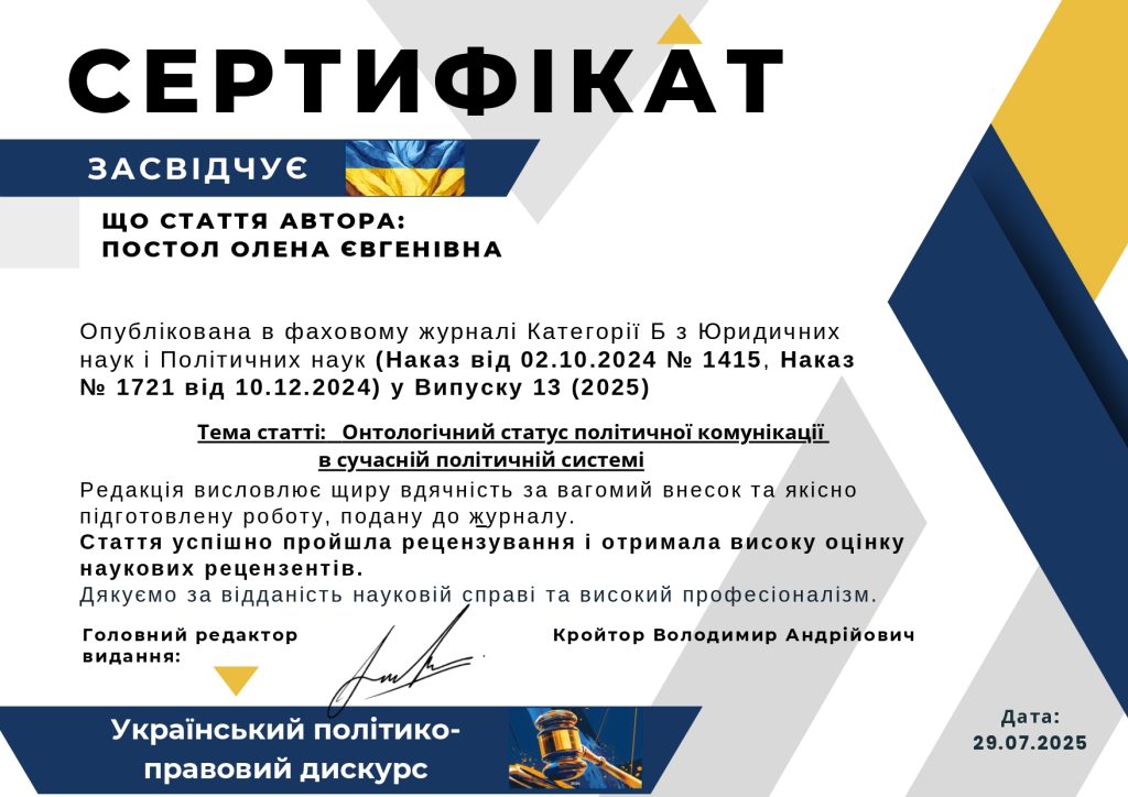 Вітаємо ПОСТОЛ Олену Євгенівну, професора кафедри “Політологія та загальноправові дисципліни” Національного університету “Запорізька політехніка”, доктора політичних наук, доцента з присвоєнням вченого звання професора по кафедрі політології та загальноправових дисциплін. Бажаємо міцного здоров’я, творчої наснаги, професійних та наукових успіхів!