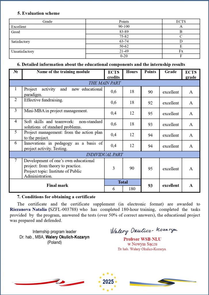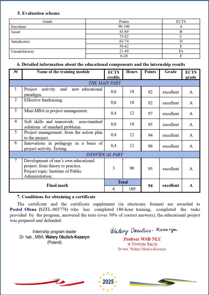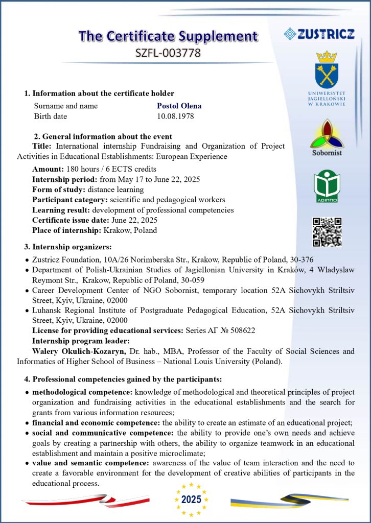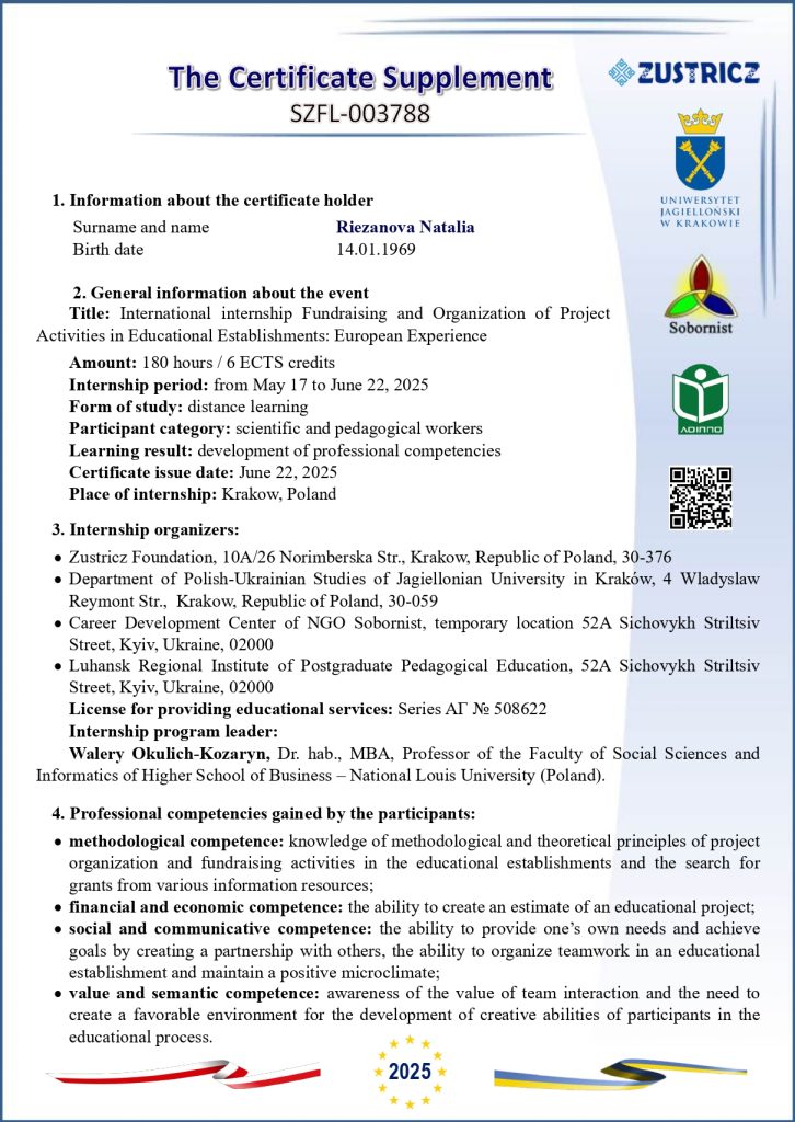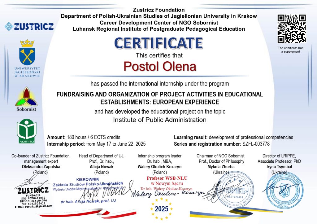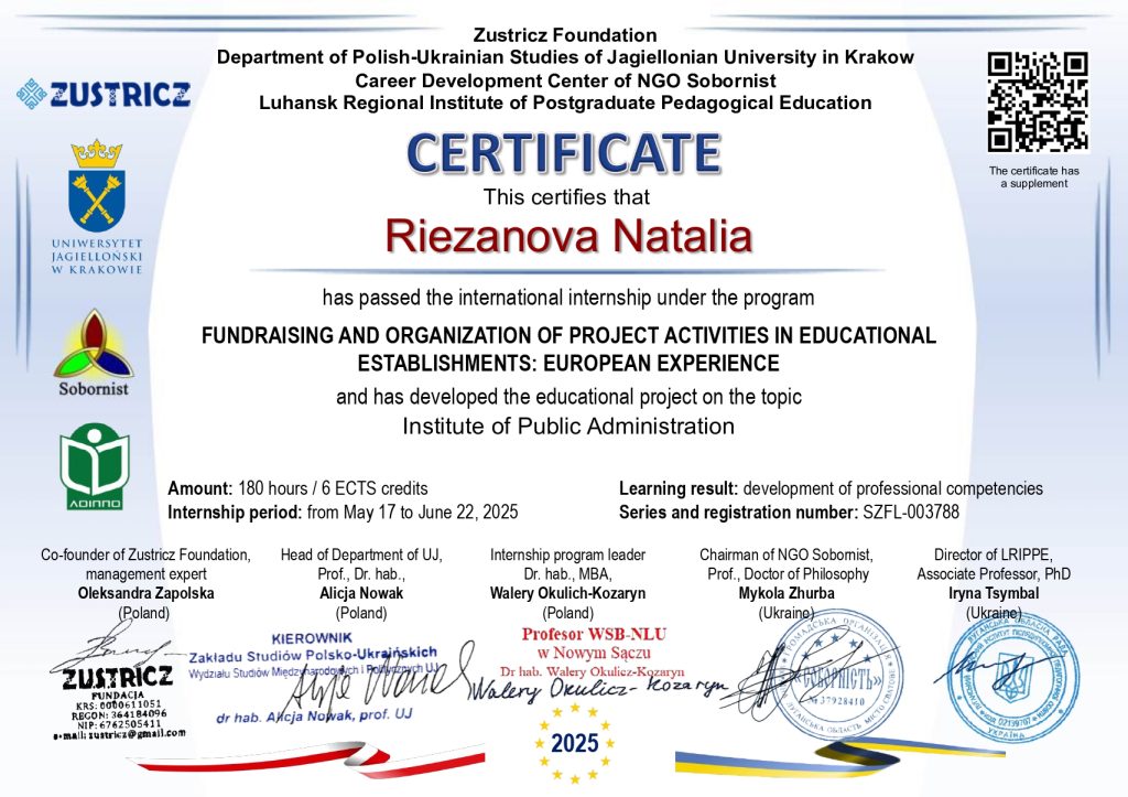 Професор кафедри “Політологія та загальноправові дисципліни”, доктор політичних наук, професор Олена ПОСТОЛ та доцент кафедри “Політологія та загальноправові дисципліни”, кандидат філософських наук, доцент Наталія РЄЗАНОВА з 17 травня по 22 червня 2025 року пройшли міжнародне стажування за програмою підвищення кваліфікації на тему “Фандрейзинг та організація проєктної діяльності в закладах освіти: європейський досвід” (180 годин/6 кредитів ЄКТС). Організатори – кафедра Польсько-Українських студій Ягеллонського університету (Республіка Польща); Центр розвитку кар’єри ГО “Соборність” (Україна).