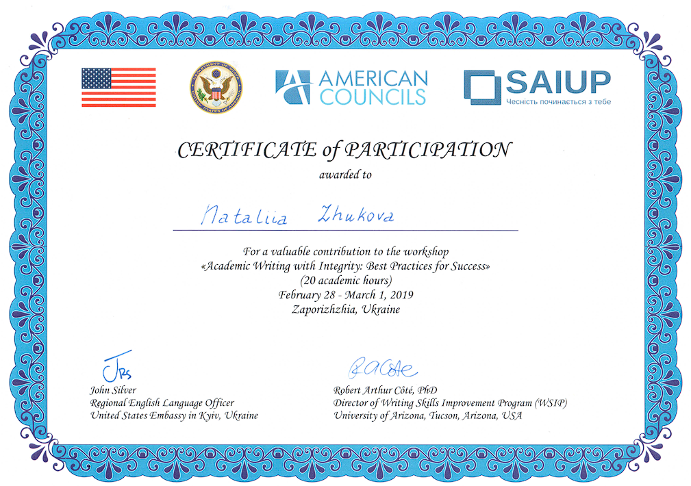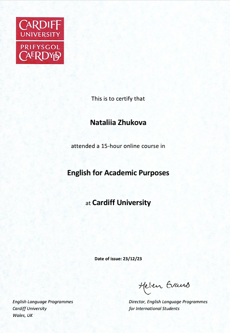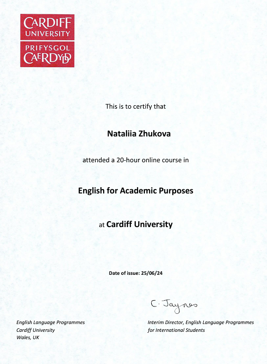 Сертифікати в.о. завідувачки кафедри “Іноземна філологія та переклад” Наталії ЖУКОВОЇ